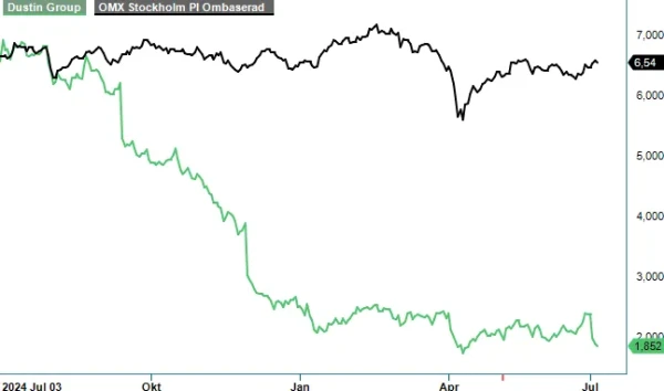 IT-återförsäljaren Dustin levererade ännu en svag rapport i veckan, vilket sänkte aktien kraftigt (-16,4% på rapportdagen).
