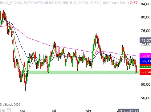 Det är omkring 63 - 64 kronor som ett viktigt stödområde möter. Köparna behöver försvara detta för att undvika ett fall ner mot 58 - 60 kronor. Aktien stängde på 63,64 kronor i fredags.