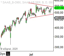 Saab handlas just nu i en konsolidering, där volatiliteten gradvis minskar. Ett utbrott kan ge tydliga signaler om hur nästa trendfas kommer att se ut i Saab.