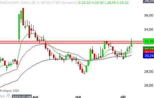 Vi noterar att Sinch sökt sig upp mot cirka 32 kronor. Här möter aktien ett motståndsområde, och skulle köparna etablera aktien ovanför detta, finns förutsättningar för en ny uppgångsfas mot 37 kronorsnivån.
