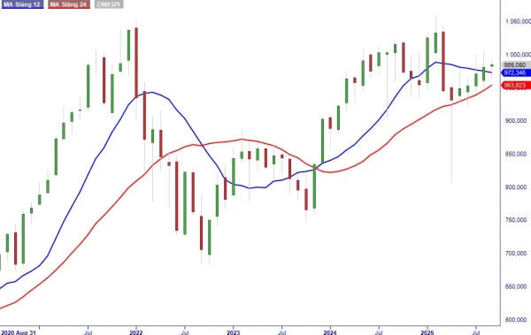 Positiv september innebär att även den underliggande trenden förblir positiv. Även om det stundom inte känts som det i år, så har den underliggande riktningen varit uppåtriktad i nära ett års tid nu. I alla fall om man beaktar min enkla tekniska trendmodell som baseras på 12- och 24-månaders glidande medelvärden i förhållande till varje månads stängningsvärde. Som framgår av den bifogade grafen landade även septembers avslutning ovan de båda vilket är vad som definierar en upptrend. Detta i synnerhet som 12-månaders glidande medelvärde åter håller till ovan 24-månaders.