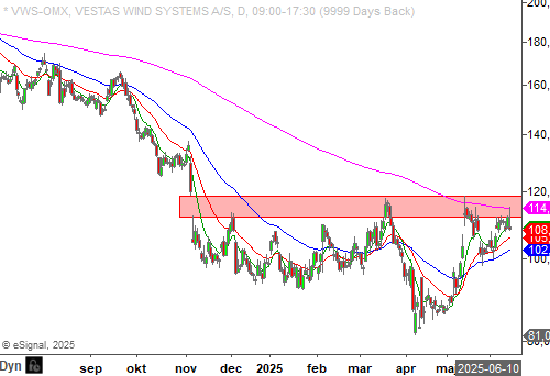 Vi ser att det finns ett riktigt tufft motstånd i höjd med cirka 114 - 120 kronor, och vår hypotes är att säljarna inom kort tar över igen. En nedgång mot 92 - 95 kronor är det huvudscenario vi ser. Vi vill dock se att månadstrenden vänder nedåt innan vi överväger position i Vestas.