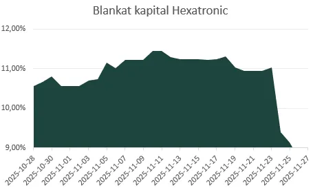 Om vi går över till Hexatronic ser vi ett ännu tydligare mönster med minskade blankningspositioner. Från nivåer över 11% för bara några veckor sedan, ner mot 9% av kapitalet blankat just nu.