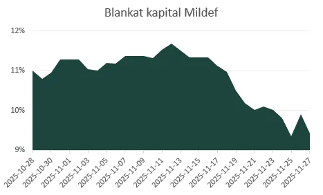 Grafen ovan visar blankat kapital i Mildef och vi ser att andelen blankat kapital fallit från cirka 11% ner till 9,4% på relativt kort tid. Andelen ligger fortfarande på en väldigt hög nivå, men det är ändå en procentuell stor förändring på så pass kort tid.