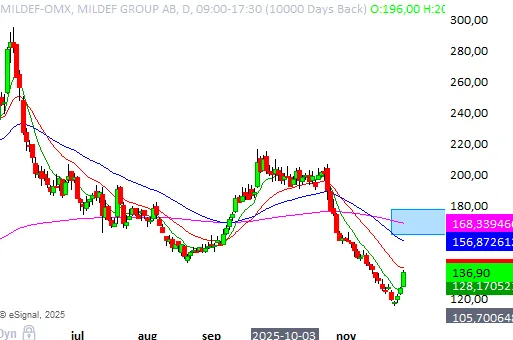Tittar man på Mildef i ett tekniskt perspektiv ser vi att vi fått en sentimentvändning efter en riktigt kraftfull nedgångsfas. Nästa viktiga tekniska område möter kring 168 - 169 kronor i form av den långa grundtrenden. Köparna behöver lyfta tillbaka aktien ovanför denna för att återta kommandot. Det första steget är dock nu taget i och med att avslut sker ovanför den korta trendindikatorn för första gången på många veckor.