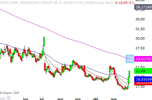 Momentum har varit så pass starkt i Hexatronic de senaste dagarna att vi räknar med att 200 dagars medelvärde kan testas i den pågående uppgångsfasen. Viktigt blir också att bygga en högre topp samt i nästa nedgångsfas en högre botten. Aktien är väl värd att bevaka.