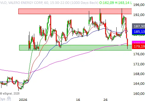 Valero Energy Corp har konsoliderat kring 185 dollar på sistone och vår hypotes är att det endast är en tidsfråga innan motståndet vid cirka 194 – 195 dollar tas ut. Uppsidan sträcker sig därefter mot 200 dollarsnivån.