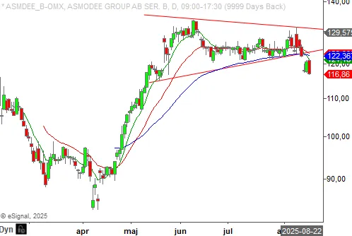 I ett tekniskt perspektiv ser vi att Asmodee fallit ur en konsolideringsformation och nu sker avslut under samtliga trendindikatorer. Sentimentet har alltså klart försvagats. Nivåer upp mot 123,5 kronor bör återtas för att sentimentet ska bli starkare igen.