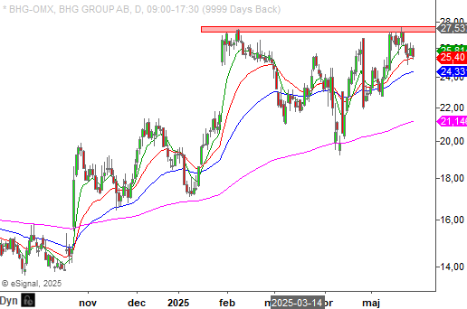 Ett viktigt motståndsområde möter i höjd med cirka 27,6 kronor. Detta område har testats flera gånger men det har ännu inte funnits styrka för ett utbrott. Området är dock intressant att hålla under bevakning då ett utbrott skulle kunna innebära att köparna är redo att lyfta BHG Group mot 30 kronor.