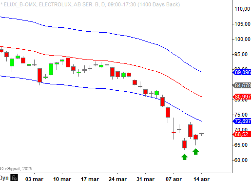 Electrolux har på sistone handlats nästan 20 procent under sitt 30 perioders medelvärde och är därmed också kraftigt översåld.