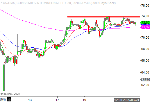 Coinshares bottnade kring 61 kronor för några veckor sedan och därefter har köparna lyft aktien mot 74 kronor. Här ser vi hur ett motstånd bildats och det är ett utbrott här i den tidiga handeln idag som kan locka in köpflöden till en positiv trenddag.
