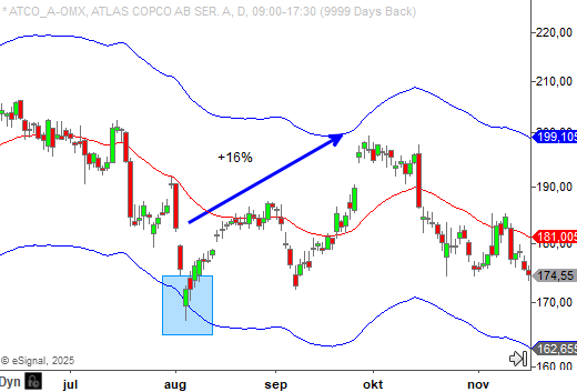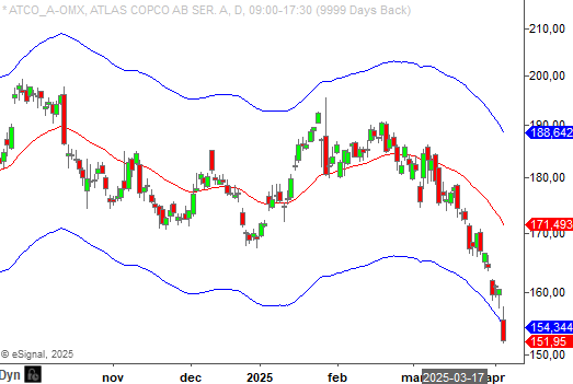Atlas Copco stängde igår över 10 procent under sitt 30 perioders medelvärde, vilket innebär att aktien är så pass översåld att bottenfiske lockar. En motreaktion bör kunna ge en rörelse på uppemot 10 procent.