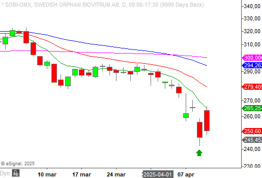 Det som vi nu håller utkik efter är en högre botten i dagsperspektivet. Vi vill alltså se att nästa botten bildas högre än 241,8 kronor, vilket var lägsta betalkurs i onsdags. Blir så fallet och om Sobi därefter bryter upp över tidigare handelssessions högsta, kan vi få ett intressant läge att börja bygga position. Sobi tar därmed plats på vår bevakningslista.