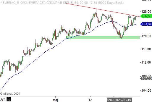 Gårdagens stängning skedde precis vid en fallande motståndslinje vilket innebär att vi får ett positivt utbrott vid en öppning ovanför 126,5 kronor. Får vi ett högt momentum i aktien är det inte alls omöjligt att Embracer söker sig upp mot grundtrenden som finns vid cirka 142,4 kronor.
