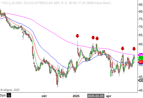 Hittills har köparna misslyckats i sin uppgift att vända den långa trenden och det är tveksamt om det finns styrka för en trendvändning just nu. Skulle säljarna sänka Eolus mot medellånga trendindikatorerna, ökar risken för att nivåer ner mot 45 kronor blir aktuella igen.
