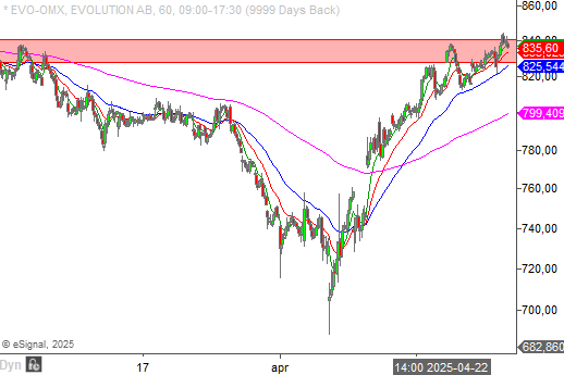 För att köparna ska kunna hålla kvar sitt övertag, är det viktigt att man lyckas etablera Evolution ovanför cirka 840 kronor. Här möter ett kortsiktigt motstånd som har testats de senaste dagarna.