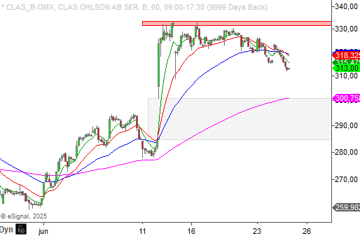 Kortsiktigt finns ett motstånd vid 331 - 334 kronor medan det viktigaste stödområdet finns i höjd med det gap som bildades i samband med rapporten. Senast här vill vi se köpare komma emot igen. Clas Ohlson tar plats på vår bevakningslista och vi återkommer om vi ser ett köpläge i aktien.