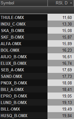 Tittar man på Large Cap, finns det en hel del aktier som just nu är rejält översålda och har ett RSI-värde under 20.