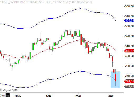 Aktien handlas nu cirka 10 procent från sitt 30 dagars medelvärde, så pass översålda nivåer ser man extremt sällan i Investor. En motreaktion bör så småningom kunna bli aktuell och vi placerar aktien på vår bevakningslista.