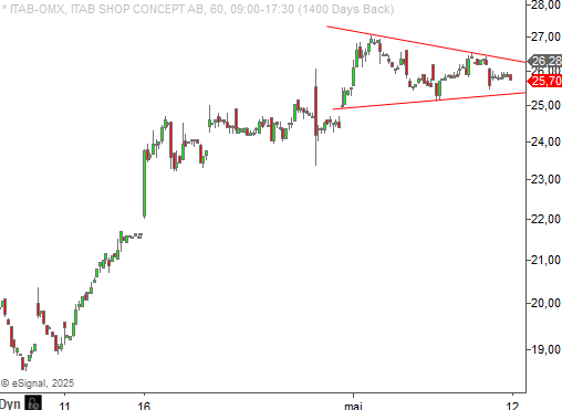 I ett intradagsperspektiv ser vi att en konsolideringsformation bildats de senaste handelssessionerna och skulle det finnas styrka för ett utbrott förbi cirka 26,3 kronor idag, finns förutsättningar för en ny uppgångsfas.