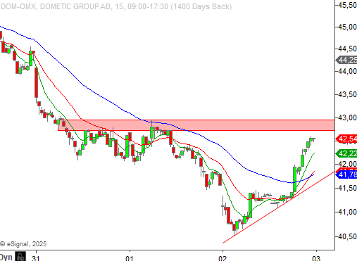 Omkring 42,7 - 43 kronor möter ett kortsiktigt motstånd och det är ett utbrott här som krävs för att en större rekylfas ska ta vid. Detta är dock inte vårt huvudscenario idag.