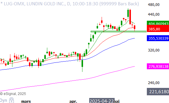 Det förbättrade risksentimentet har resulterat i att Lundin Gold tappat mark på sistone. Rekylen är intressant att hålla ett öga på då trenden fortsättningsvis är riktigt stark. Ett stödområde finns omkring 375 - 378 kronor, håller detta finns förutsättningar för en motreaktion.