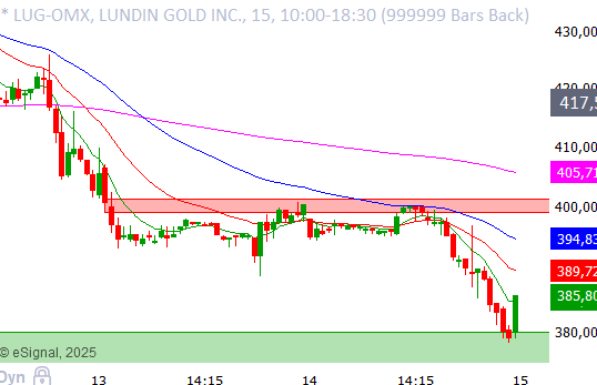 I ett intradagsperspektiv ser vi att 400 kronor är ett kortsiktigt motstånd. Ett utbrott här skulle kunna ge den bekräftelse som köparna behöver för att driva upp Lundin Gold mot 460 - 465 kronor igen.