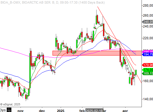 Nu räknar vi med att nivåer upp mot 195 - 198 kronor kan bli aktuella om köparna tar ett större övertag. Detta bygger på att korta trendindikatorn vid 169,1 kronor inte åter ger vika.