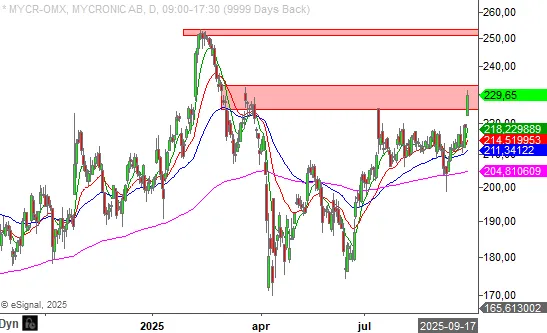Det är i höjd med 225 - 233 kronor som säljare tidigare kommit emot, igår stängde Mycronic på 229,65 kronor. En etablering ovanför motståndet bör kunna leda till att årshögsta testas.
