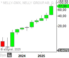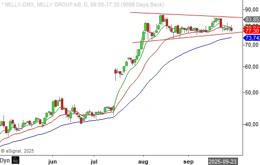 Lyckas köparna få till ett utbrott, bör tresiffriga noteringar ligga nära till hands för Nelly. På nedsidan ser vi stödområdet vid 74 - 76 kronor som viktigt. Ger det vika kan en djupare rekyl ta vid.