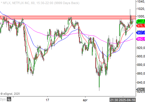 Som tydligt framgår av intradagsgrafen ovan är 1 000 dollar en viktig nivå. Igår gjorde köparna ett försök att lyfta aktien förbi detta motstånd men en nedgång på 2,6 procent i Nasdaq gav inte den underliggande styrka som behövdes för en stängning ovanför 1 000 dollar. Nya utbrottsförsök lär dock göras och vi räknar med att vi kan få se högre kursnivåer framöver i Netflix.