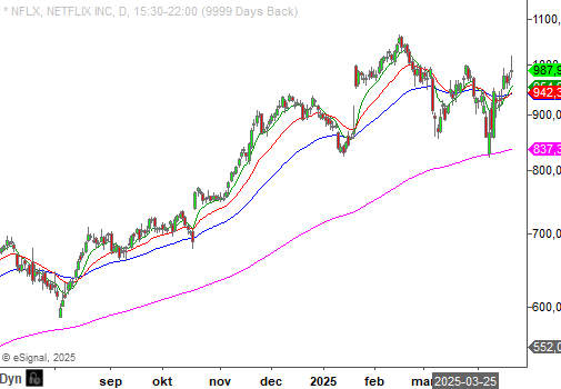 Tittar man på dagstrenden ser man att Netflix hör till en av de mest trendstarka aktierna. Avslut sker ovanför långa trendindikatorn och detta är en utveckling som vi räknar kommer att hålla i sig.