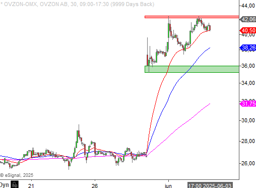 Det är närmast kring 35 - 36 kronor som Ovzon har ett reaktionsområde och detta bör vara ett intressant ställe att börja bygga position. Toppmotstånd möter kring 42,2 - 42,5 kronor.