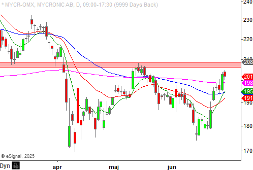 I ett tekniskt perspektiv är området kring 206 - 209 kronor viktigt. Skulle det finnas styrka för ett utbrott här, kan nivåer upp mot 230 - 235 kronor bli aktuella. Det gäller dock för köparna att man håller kvar aktien ovanför trendindikatorerna.