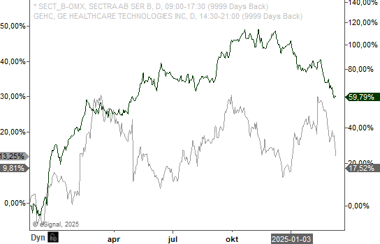 Sectras amerikanska konkurrent GE HealthCare har faktiskt utvecklats svagare än Sectra de senaste sex månaderna. Så sent som i onsdags höjde Goldman Sachs GE HealthCare till köp, men det gav inga större avtryck i aktien. Sektorn som helhet ser därmed inte ut att intressera placerare i detta nu.