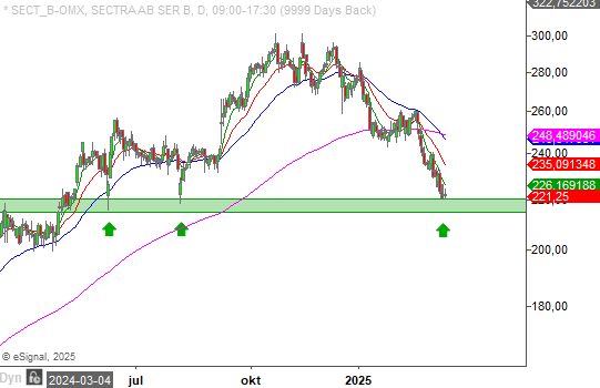 Säljarna har sänkt Sectra mot det stödområde som möter omkring 218 kronor och det blir spännande att se dagens kursreaktion. Vänder aktien från stödet, finns förutsättningar för ett lyft mot långa trendindikatorn vid 248,5 kronor. Däremot, om stödet ger vika, kan nivåer ner mot 200 kronor bli aktuella.
