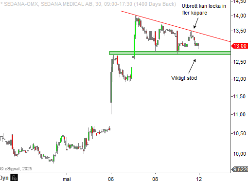 I ett kortare perspektiv (30 minuter) ser vi att Sedana konsoliderade under slutet av förra veckan. Den som är intresserad av att positionera sig i aktien har några viktiga nivåer att hålla under uppsikt.