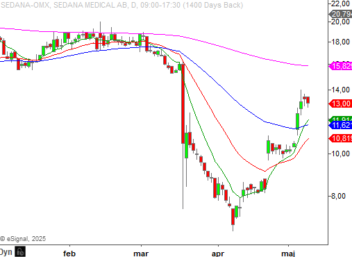 En aktie som gick starkt under förra veckan var Sedana Medical. Stora delar av nedgången i mars har aktien nu tagit igen och i ett dagsperspektiv ser vi att långa grundtrenden så småningom är inom räckhåll. Avslut sker ovanför 8-, 21- och 50-perioders medelvärden.