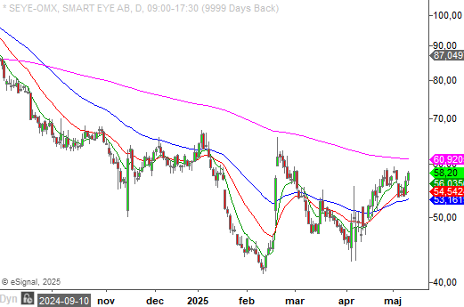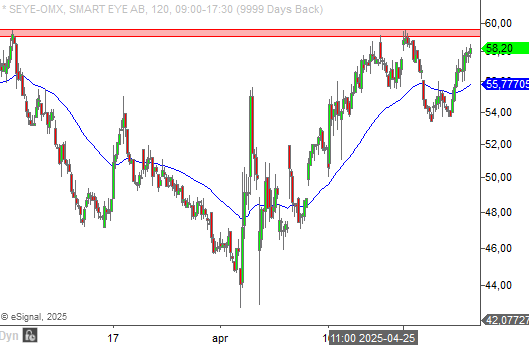 Handeln har varit väldigt volatil på sistone men inför rapporten har Smart Eye sökt sig upp mot 200 perioders medelvärde som möter strax under 61 kronor. Det var under första delen av 2024 som Smart Eye senast handlades i en positiv grundtrend.