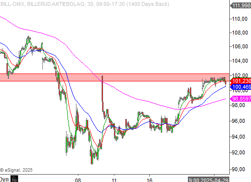 Tittar man på trendläget i ett dagsperspektiv, pekar 8 och 21 perioders medelvärden uppåt och långa grundtrenden möter strax under 106 kronor. Även Billerud är väl värd att bevaka idag.