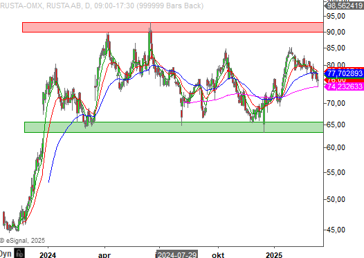 I ett tekniskt perspektiv ser vi att Rusta handlas ungefär i mitten av det stora intervall som bildades under fjolåret. Den långa trenden är stigande och det blir spännande att se om aktien kan ta sig upp mot topparna vid 85 kronor. Passeras dessa, lär vi få ett nytt test av området vid 90 - 94 kronor. Detta är vårt huvudscenario för Rusta.