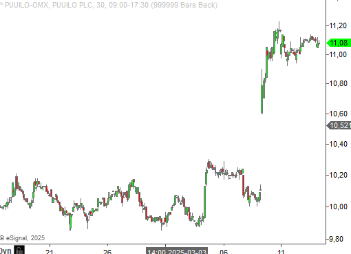 Puuilo inledde med ett kraftigt lyft i måndags och köparna har därefter hållit kvar aktien på höga kursnivåer. Något som signalerar att det kan finnas ytterligare uppsida.