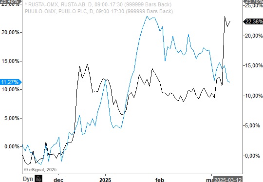 Tittar man på hur Rusta handlats mot Puuilo, ser man att Rusta gick starkare under delar av januari och februari, men i och med den omvända vinstvarningen drog Puuilo ifrån. Nu återstår det att se om Rusta kan täcka detta gap idag.