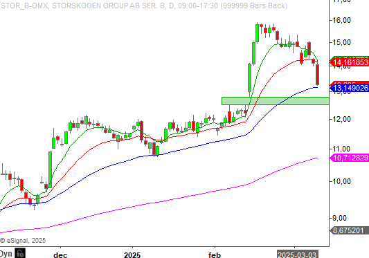 Nedgången innebär att Storskogen nu handlas vid 50 perioders medelvärde. Skulle denna trendindikator passeras, kan vi få en täckning av det gap som bildats vid cirka 12,5 kronor.