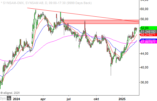 I höjd med cirka 55,3 kronor möter en fallande motståndslinje och det är ett utbrott här som skulle göra det tekniska läget riktigt intressant. Förutsättningar finns då för en uppgång mot 60 kronor. I höjd med 47 - 48 kronor finns viktigaste stödområdet.