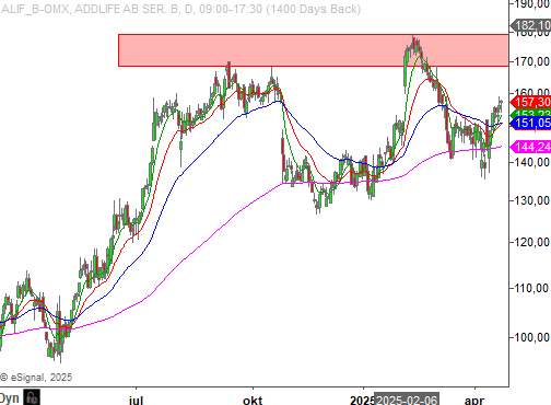För några veckor sedan föll Addlife ner under långa trendindikatorn men återhämtningen har skett snabbt och det är inte alls omöjligt att aktien igen tar sikte mot toppmotståndet vid 170 - 180 kronor.
