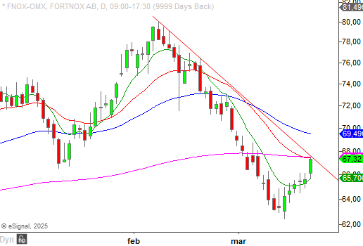 Nivåer upp mot 72,5 - 73 kronor behöver återtas för att köpare på allvar ska ta tillbaka kommandot och senast kring 69 - 70 kronor lär säljare komma emot igen. Vi återkommer till Fortnox om vi ser ett konkret affärsläge i aktien.