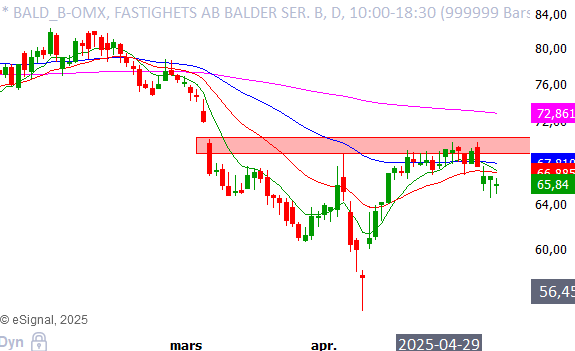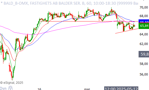 Tittar man på Balder i ett intradagsperspektiv, ser man att en kortsiktig stödnivå vid cirka 66,8 kronor har gett vika. Därefter har Balder konsoliderat strax under detta stödområde.