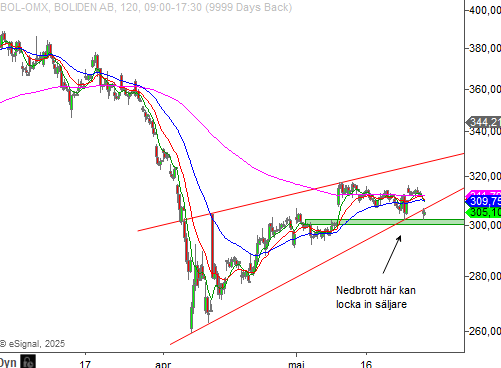 I veckan passerade Boliden stödet i den rekylformation som bildats, och nu har vi en mycket viktig stödnivå kring 300 kronor. Ett nedbrott här lär locka in bredare säljflöden, och en nedgång mot cirka 280 kronor är då ett rimligt scenario.