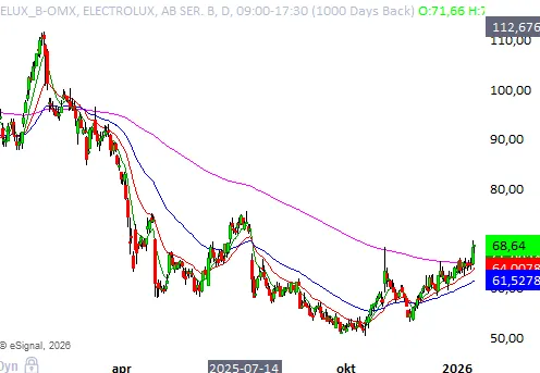 Electrolux hörde till en av förlorarna och handlades dessutom i en relativt svag trend. Den senaste rekylen har lyft aktien över 200 dagars medelvärde, men en ny vändning nedåt kan bli aktuell här.